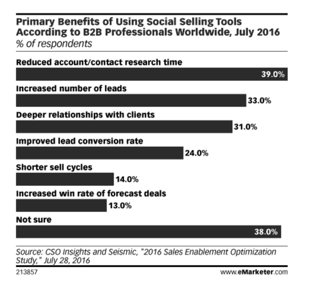Verschillende bronnen melden dat 78% van sales mensen die social selling toepassen hun collega's voorbijstreven. Deze resultaten worden gestimuleerd door de diepere en warme informatie waarmee een sales persoon een gesprek aangaat. Weten wat er speelt bij de prospect én diens bedrijf zorgt voor rapport, herkenning en uiteindelijk een beter gesprek. Verder uiten de voordelen zich in een kortere sales cycle, meer leads, hogere conversie en meer (zie afbeelding).
